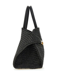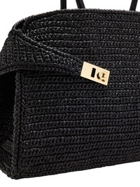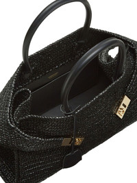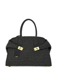 medium The Hug raffia tote bag Highlights - Black - Raffia - Leather trim - Interwoven design - Gancini flip-lock fastening - Gold-tone hardware - Hanging key fob - Adjustable side straps - Clasp fastening - Two top handles - Main compartment - Internal card slots Made in Italy Composition Outer: CALFSKIN 100%, Raffia 100% SIZE & FIT Measurement DEPTH 7.87 in(20 cm) HEIGHT 10.23 in(26 cm) STRAP 21.65 in(55 cm) WIDTH 16.14 in(41 cm)