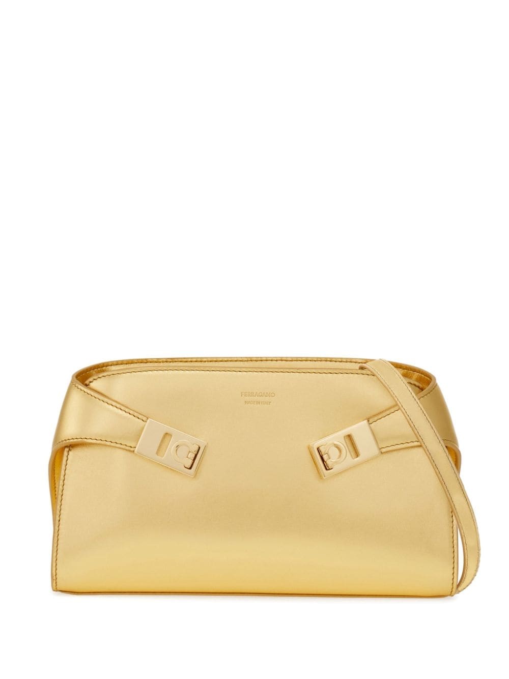 mini Hug cross body bag Highlights - Gold-tone - Leather - Metallic finish - Top zip fastening - Detachable shoulder strap - Debossed logo to the front - Gancio slider clasps - Main compartment - Internal card slots Made In Italy Composition Outer: Goat Skin 100% Lining: Lambskin 95%, Goat Skin 5% SIZE & FIT Measurement STRAP 21.65 in(55 cm)