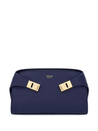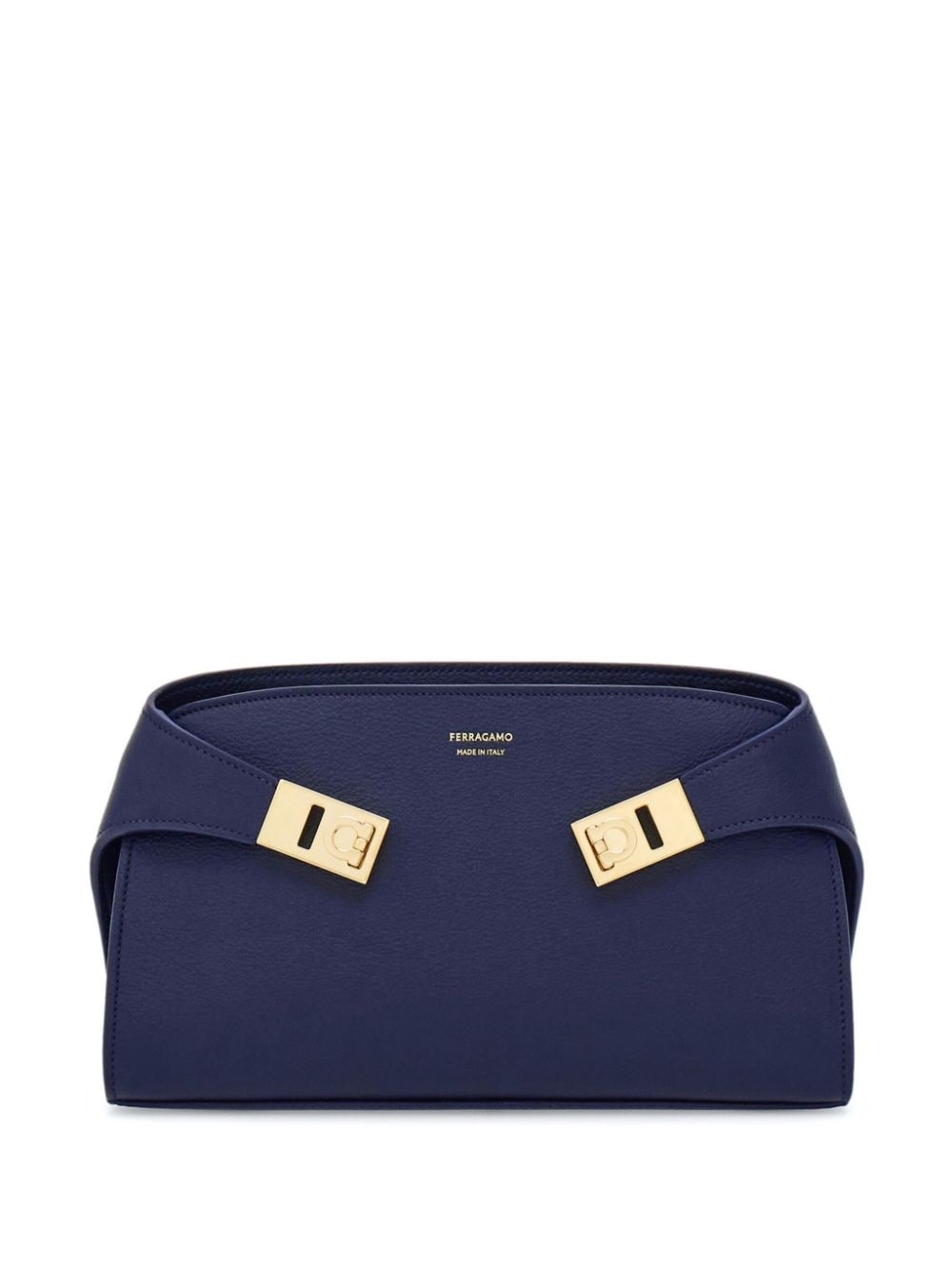 mini Hug cross body bag Highlights - Midnight blue - Calf leather - Logo stamp to the front - Adjustable detachable shoulder strap - Gancini flip-lock fastening - Top zip fastening - Main compartment - Internal card slots - Internal logo stamp - Gold-tone hardware Made in Italy Composition Outer: Calf Leather 100% Lining: Lamb Skin 95%, Calf Leather 5% SIZE & FIT Measurement DEPTH 2.36 in(6 cm) HEIGHT 5.11 in(13 cm) STRAP 50 in(127 cm) WIDTH 9.44 in(24 cm)