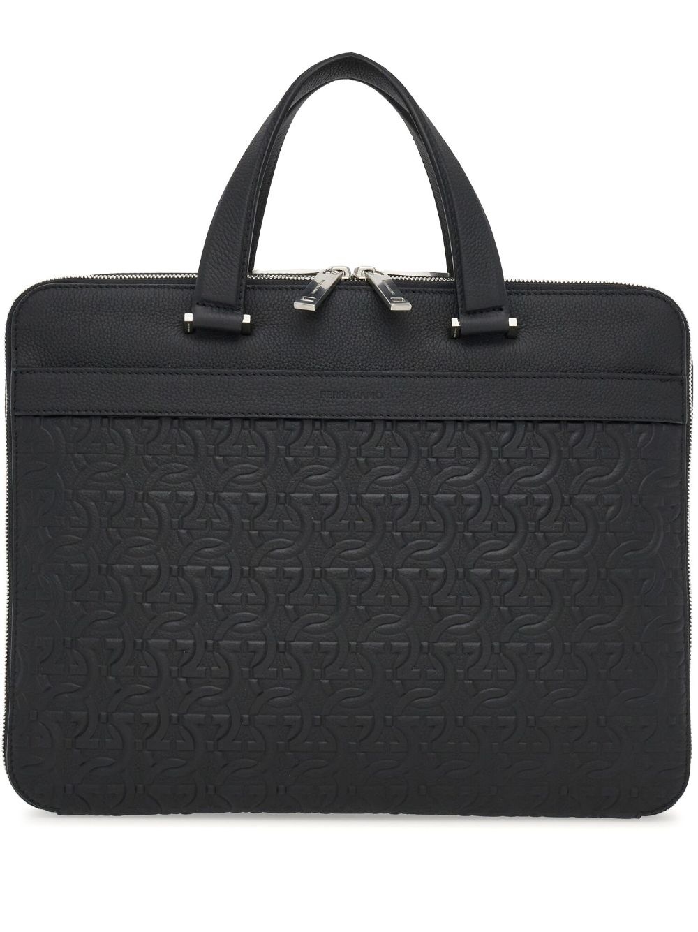 monogram-embossed leather briefcase Highlights - Jet black - Calf leather - Grained texture - Embossed monogram pattern - Silver-tone hardware - Two-way zip fastening - Two top handles - Partitioned compartment - Internal logo stamp Made in Italy Composition Outer: CALFSKIN 100%