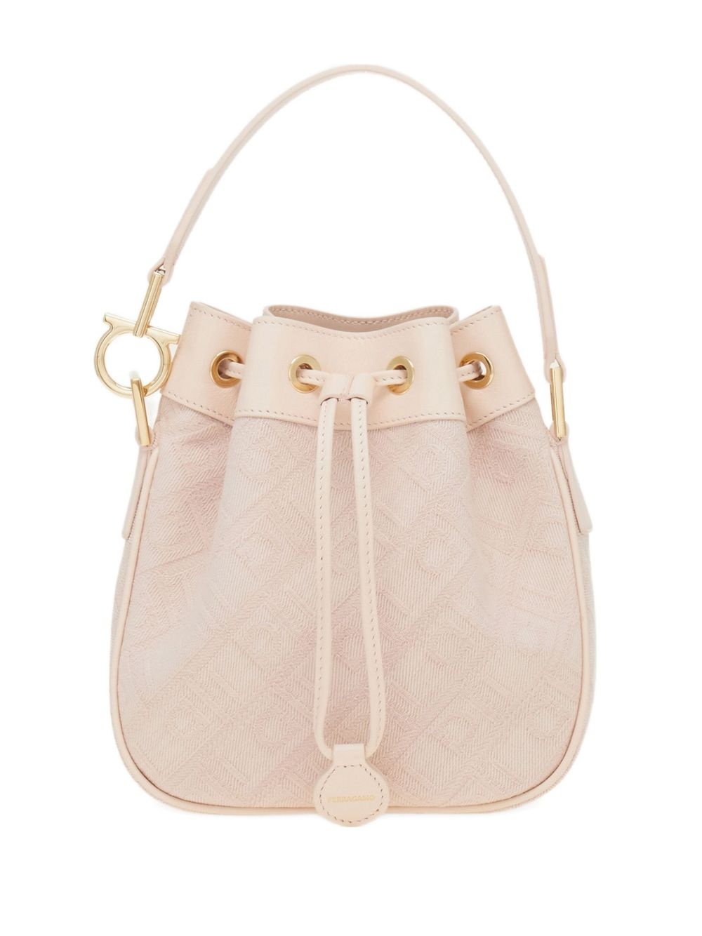 monogram-jacquard bucket bag Highlights - Light pink - Top drawstring fastening - Single flat top handle - Adjustable detachable shoulder strap - Gancini plaque Made in Italy Composition Outer: Fabric 80%, CALFSKIN 20% SIZE & FIT Measurement HEIGHT 7.87 in(20 cm) WIDTH 3.54 in(9 cm)