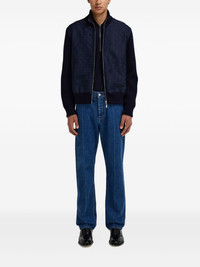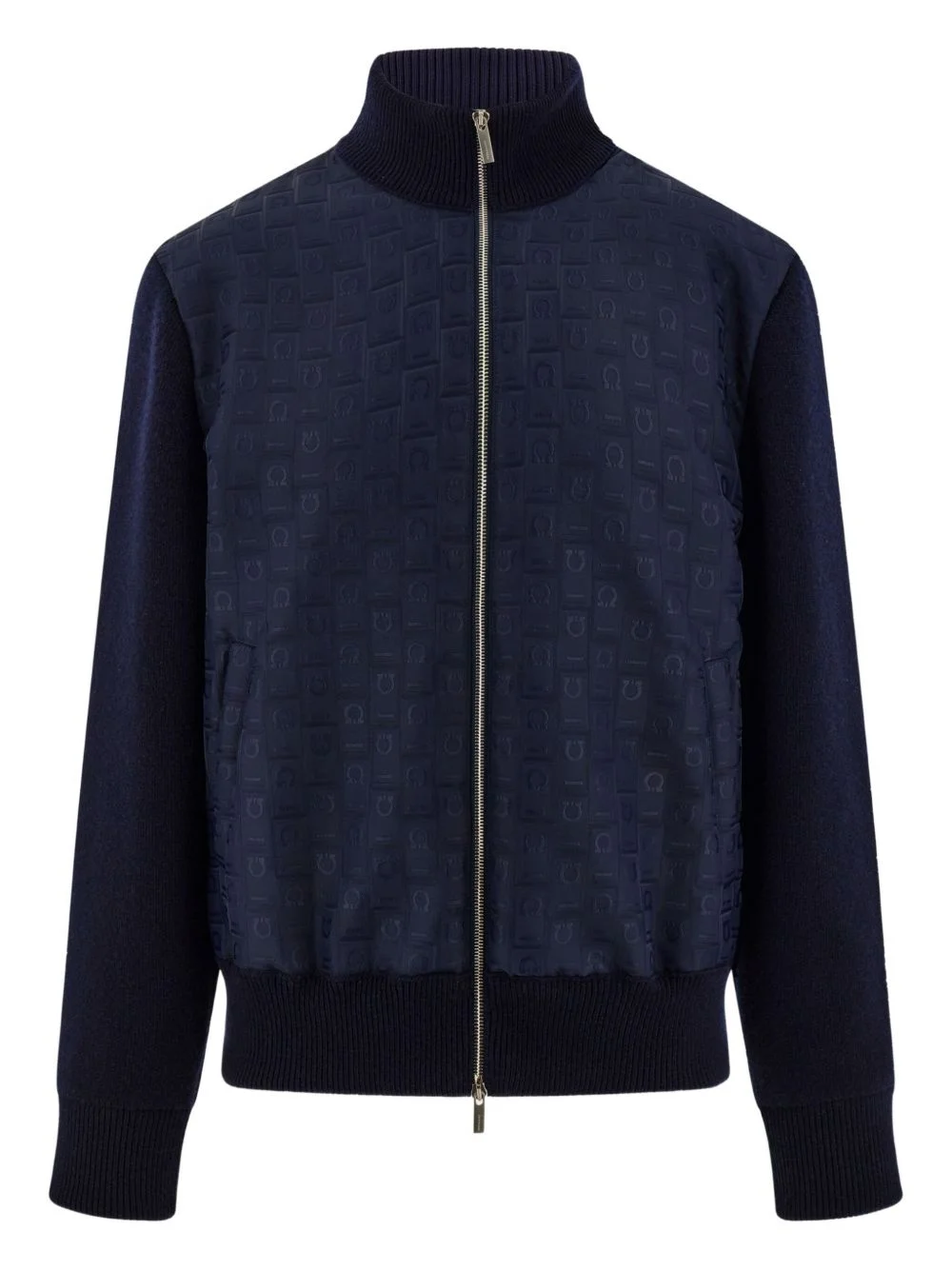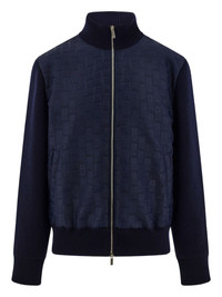 monogram jacquard knitted bomber jacket Highlights - Navy blue - Monogram jacquard pattern to the front - Knitted sleeves and back - Welt pockets - Two-way zip closure - Ribbed trims Made in Italy Composition Outer: Virgin Wool 100% Lining: Technical Fabric 50%, Wool 50% Washing instructions Read Manufacturer Guidelines