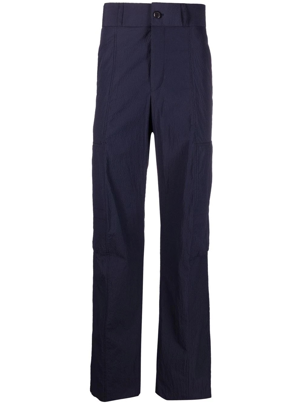multi-pocket seersucker trousers navy cotton seersucker weave two side slit pockets side pouch pockets rear button-fastening jetted pocket high waist straight leg zip fly fastening Made in Italy Composition Outer: Polyester 54%, Polyamide 46% Lining: Cotton 100% SIZE & FIT Model measurements Height 6 ft 2 in(1.89 m) Bust/Chest 37.79 in(96 cm) Hips 37 in(94 cm) Waist 29.92 in(76 cm) FittingInformation This piece fits true to size. We recommend you get your regular size Regular fit Made with a lightweight non-stretch fabric Washing instructions Hand Wash