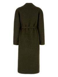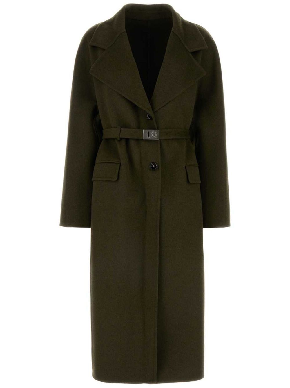 single-breasted coat Highlights - Olive green - Front button fastening - Belted waist - Two side flap pockets - Wide notch lapels Made in Italy Composition Virgin Wool 85%, Elastane 15%