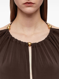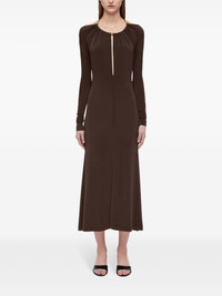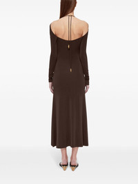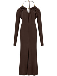 open-back crepe maxi dress Highlights - Coffee brown - Crepe texture - Round neck - Keyhole neck - Rear tie fastening - Open-back setting - Bead detailing - Long sleeves - Flared skirt - Mid-calf length - Straight hem Made in Italy Composition Viscose 96%, Spandex/Elastane 4%