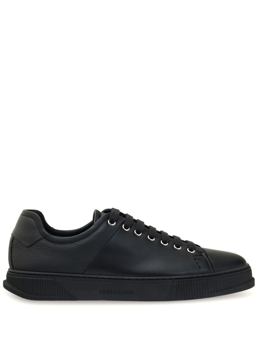 panelled leather sneakers Crafted from leather, these classic black sneakers from Ferragamo display a panelled design. Both smooth and grained panels style the lace-up fastened pair. Highlights - Black - Calf leather - Panelled design - Logo-debossed tongue - Front lace-up fastening - Round toe - Branded insole - Flat sole Made in Italy Composition Outer: CALFSKIN 100%
