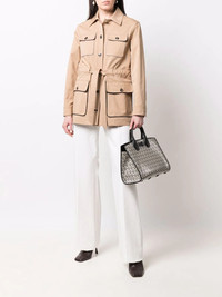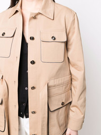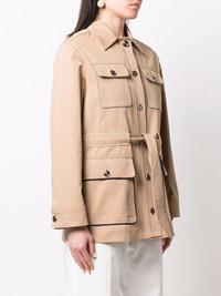 pocket-detail belted jacket Taking inspiration from animal safaris, this tied jacket from Ferragamo is designed in a muted palette of khaki beige. Its typical below pockets are detailed with black and white stitching. Made in Italy Composition Cotton 98%, Spandex/Elastane 2% SIZE & FIT Model measurements Height 5 ft 10 in(1.78 m) Bust/Chest 31.49 in(80 cm) Hips 36.22 in(92 cm) Waist 25.59 in(65 cm) FittingInformation This piece fits true to size. We recommend you get your regular size Cut for a loose fit. Comes with an adjustable belt for a flexible fit at the waist Made with a mid-weight stretch fabric Washing instructions Dry Clean Only