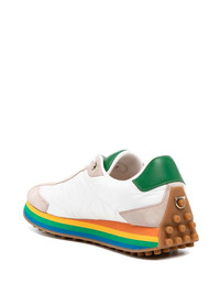 rainbow-soled low-top sneakers rainbow-soled low-top sneakers from SALVATORE FERRAGAMO featuring white, multicolour, calf suede, rainbow stripe detailing, panelled design, quilted finish, logo print to the side, round toe, front lace-up fastening, logo-debossed tongue, Gancini plaque and branded leather insole. Made in Italy Composition Body: Fabric 60%, Calf Leather 40% Lining: Leather 50%, Fabric 50% Sole: Rubber 100% SIZE & FIT Measurement HEEL 1.37 in(3.5 cm) Sole height 0.98 in(2.5 cm)