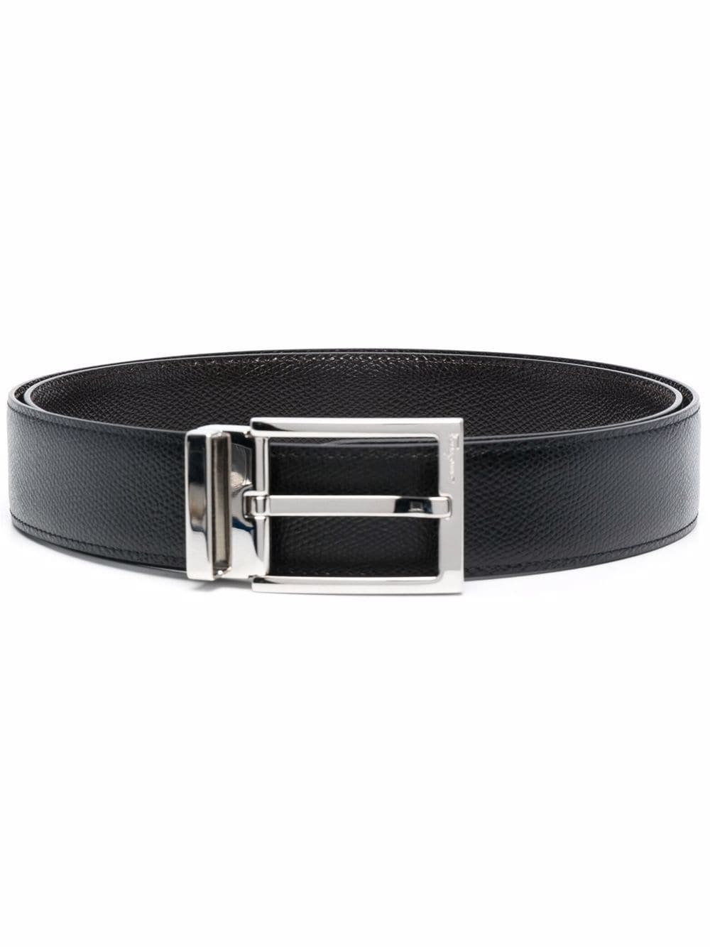 rectangle buckle reversible belt An essential accessory to bring every outfit together. No man can go without his Salvatore Ferragamo engraved-logo buckle belt. Featuring silver-tone hardware and an adjustable fit. Belt it out. Highlights - Black - Leather - Reversible buckle fastening - Punch-hole detailing - Adjustable fit Made in Italy Composition Calf Leather 100% SIZE & FIT Measurement Minimum Length 39.37 in(100 cm) TOTAL LENGTH 43.3 in(110 cm) WIDTH 1.37 in(3.5 cm)