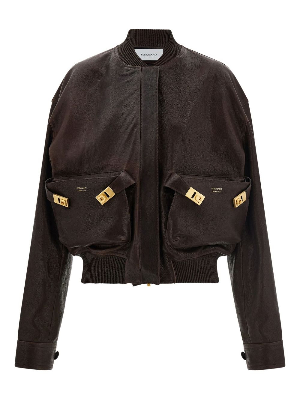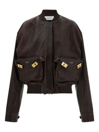 ribbed-trim patch-pocket bomber jacket Highlights - Dark brown - Leather - Wrinkled finish - Patch pockets - Gold-tone buckles - Ribbed trims Made in Italy Composition Outer: Goat Skin 100% Lining: Rayon 100% Washing instructions Read Manufacturer Guidelines