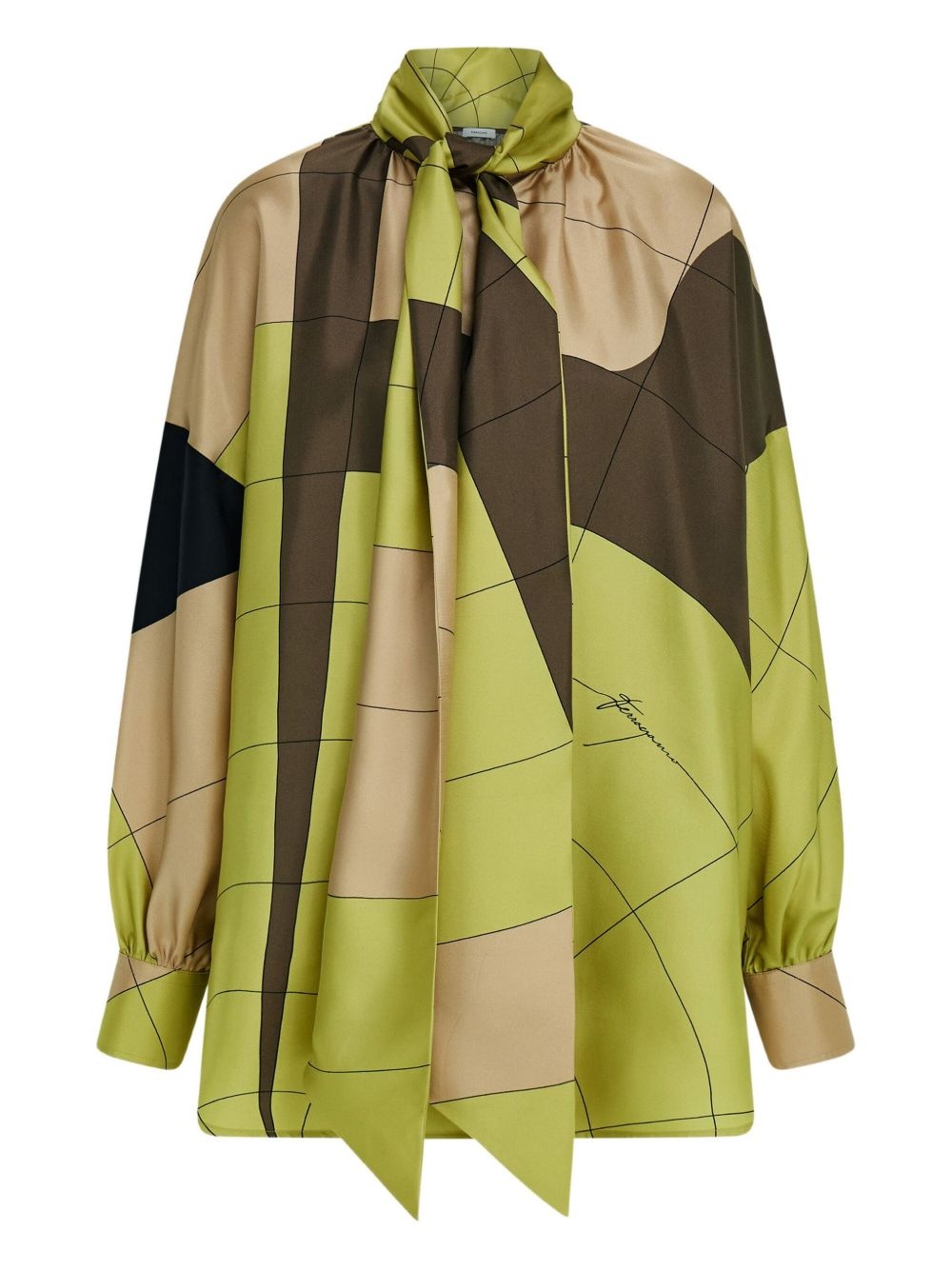 sash-detail silk shirt Highlights - Lime green - Front button fastening - Long sleeves - Buttoned cuffs - Geometric-pattern print Made in Italy Composition Silk 100%