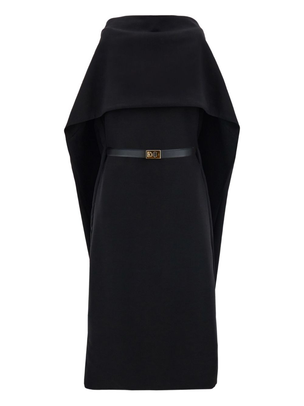 shawl-collar belted midi dress Highlights - Black - Wool faille construction - Integrated shawl collar - Deep v-cut back - Belted waist - Gold buckle detail Made in Italy Composition Outer: Viscose 73%, Virgin Wool 27% Lining: Rayon 100% Washing instructions Read Manufacturer Guidelines