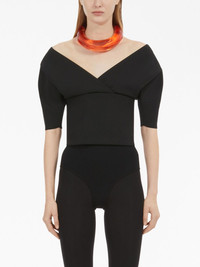 short-sleeve knitted top Highlights - Black - Wool blend - Knitted construction - Belted waist - Rear zip fastening - V-neck - Short sleeves - Straight hem Made in Italy Composition Outer: Wool 69%, Nylon 23% Lining: Spandex/Elastane 8%
