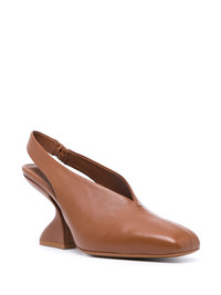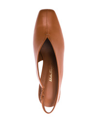 85mm Sloane chunky-heel pumps When modern art meets fashion, a pair of Sloane pumps appear. Designed to turn heads, this pair from Ferragamo boasts a notable sculptured heel. All eyes on your feet. Highlights - Brown - Leather - High sculpted heel - Branded insole - Square toe - Elasticated slingback strap Made in Italy Composition Outer: Leather 100% Lining: Leather 100% Sole: Leather 100% SIZE & FIT Measurement HEEL 3.14 in(8 cm)