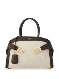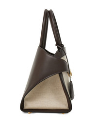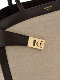 small Hug tote bag Highlights - Off-white/brown - Calf leather - Logo print to the front - Luggage tag - Strap detailing - Clasp fastening - Two rolled top handles - Detachable shoulder strap - Internal zip-fastening pocket Made in Italy Composition Outer: CALFSKIN 60%, Fabric 40%