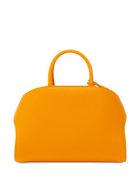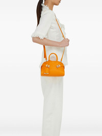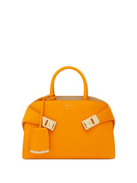 small Hug tote bag Highlights - Orange - Two rolled top handles - Adjustable detachable shoulder strap - Gancini buckle - Main compartment Made in Italy Composition Outer: CALFSKIN 100% Lining: Lambskin 100% SIZE & FIT Measurement DEPTH 4.33 in(11 cm) HANDLE 2.95 in(7.5 cm) HEIGHT 5.51 in(14 cm) WIDTH 8.85 in(22.5 cm)