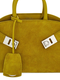 small Hug tote bag Highlights - Green - Two top handles - Adjustable detachable shoulder strap - Gancini buckle - Main compartment Made in Italy Composition Outer: Calf Suede 100% SIZE & FIT Measurement DEPTH 4.33 in(11 cm) HANDLE 2.95 in(7.5 cm) HEIGHT 5.51 in(14 cm) WIDTH 8.85 in(22.5 cm)