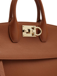 small Studio Soft leather tote bag Highlights - Cognac brown - Calf leather - Grained texture - Gancini plaque - Logo-engraved gold-tone hardware - Strap detailing - Two rolled top handles - Adjustable detachable shoulder strap - Gancini flip-lock fastening - Front flap pocket - Main compartment - Removable pouch Made in Italy Composition Outer: Calf Leather 90%, Fabric 10% Lining: Goat Skin 100%
