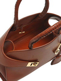 small The Hug leather tote bag Highlights - Cognac brown - Calf leather - Gancini flip-lock fastening - Logo stamp to the front - Gold-tone hardware - Hanging key fob - Adjustable side straps - Clasp fastening - Two top handles - Main compartment - Internal zip-fastening pocket - Metal feet Made in Italy Composition Outer: Calf Leather 100% Lining: Lamb Skin 97%, Calf Leather 3% SIZE & FIT Measurement DEPTH 7.48 in(19 cm) HEIGHT 8.66 in(22 cm) STRAP 21.65 in(55 cm) WIDTH 12.4 in(31.5 cm)