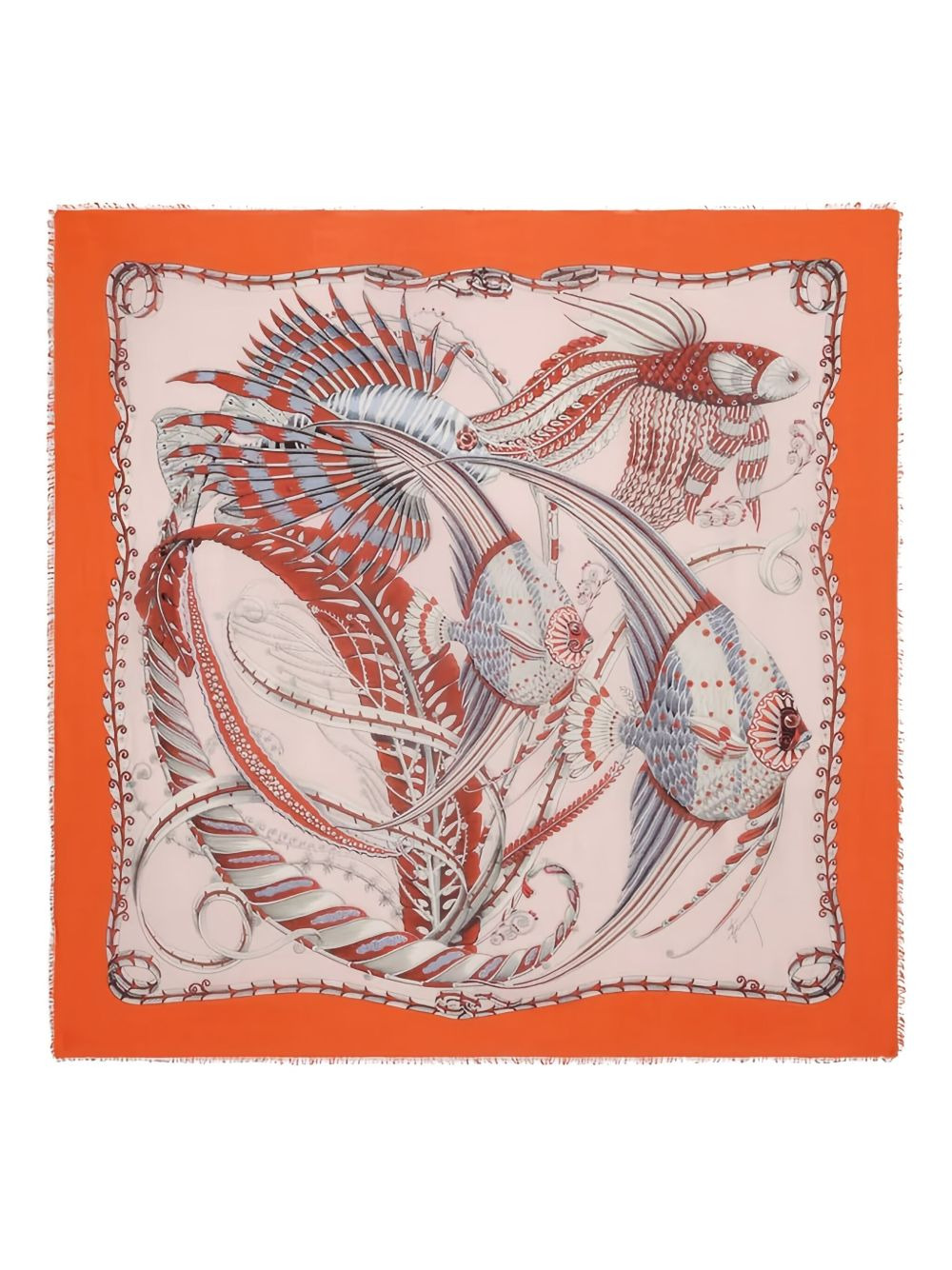 SUMMER2 fish-printed silk scarf Highlights - Orange rose - Graphic print - Fringed edge Made in Italy Composition Silk 100% SIZE & FIT Measurement LENGTH 35.43 in(90 cm) WIDTH 35.43 in(90 cm) Washing instructions Read Manufacturer Guidelines