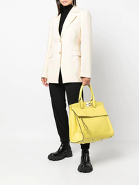 The Studio leather tote bag yellow calf leather grained texture silver-tone logo plaque twist-lock closure two rounded top handles front zip-fastening pocket partitioned compartment Made in Italy Composition Outer: Calf Leather 100% SIZE & FIT Model measurements Height 5 ft 11 in(1.8 m) Bust/Chest 33.07 in(84 cm) Hips 37.4 in(95 cm) Waist 25.19 in(64 cm) Measurement DEPTH 7.87 in(20 cm) HANDLE 7.08 in(18 cm) HEIGHT 13.77 in(35 cm) WIDTH 16.53 in(42 cm)