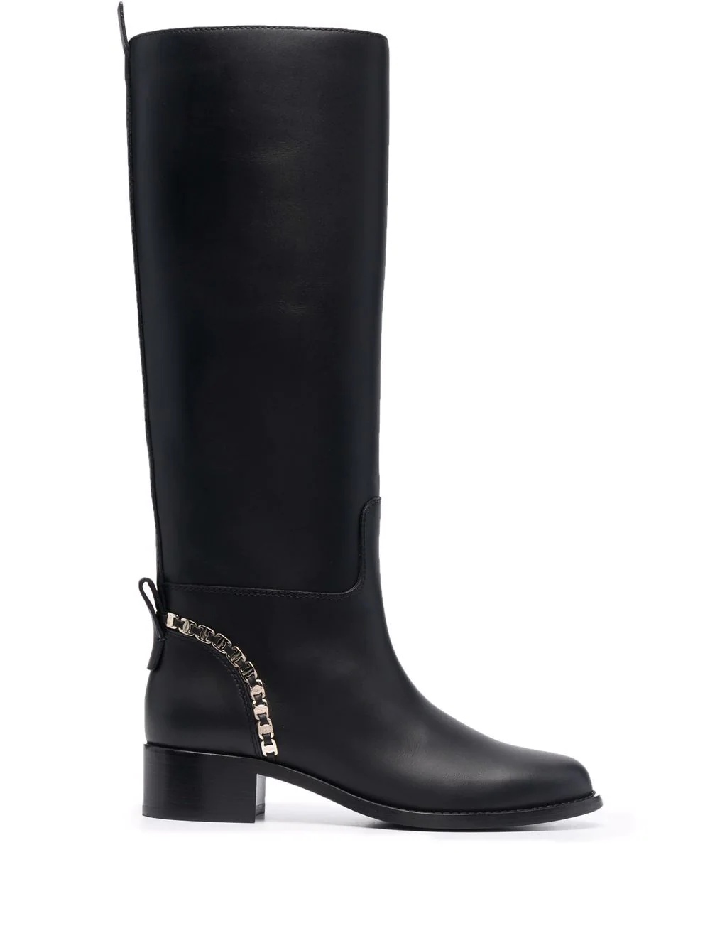 Vara Chain knee-high boots Crafted from black soft leather, these knee-high boots from Ferragamo are elegantly adorned with the brand's signature Vara Chain detail in polished gold-tone hardware. Made in Italy Composition Sole: Rubber 100% Lining: Calf Leather 100% Outer: Calf Leather 100% SIZE & FIT Measurement CIRCUMFERENCE 13.38 in(34 cm) HEEL 1.96 in(5 cm) HEIGHT 15.74 in(40 cm) Sole height 0.59 in(1.5 cm)
