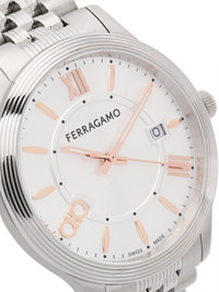 Pair Duo 40mm Highlights - 40mm - White/silver-tone - Stainless steel - Brushed finish - Quartz movement - Gancini plaque - Roman numeral dial - Logo print to the front - Sword hands - Day-date display - Screw-down crown - Adjustable link bracelet - Deployant-clasp fastening - Logo-engraved buckle - Water resistance up to 50m/5 atm - This item comes with a standard one-year warranty from the brand. - Original box included. Imported Composition Sapphire Crystal 100%, stainless steel 100% SIZE & FIT Model measurements Height 6 ft 2 in(1.87 m) Bust/Chest 38.18 in(97 cm) Hips 36.61 in(93 cm) Waist 29.13 in(74 cm) Measurement CIRCUMFERENCE 7.99 in(20.3 cm) DIAMETER 1.57 in(4 cm) Thickness 0.35 in(0.9 cm) WIDTH 0.66 in(1.7 cm)
