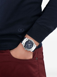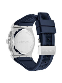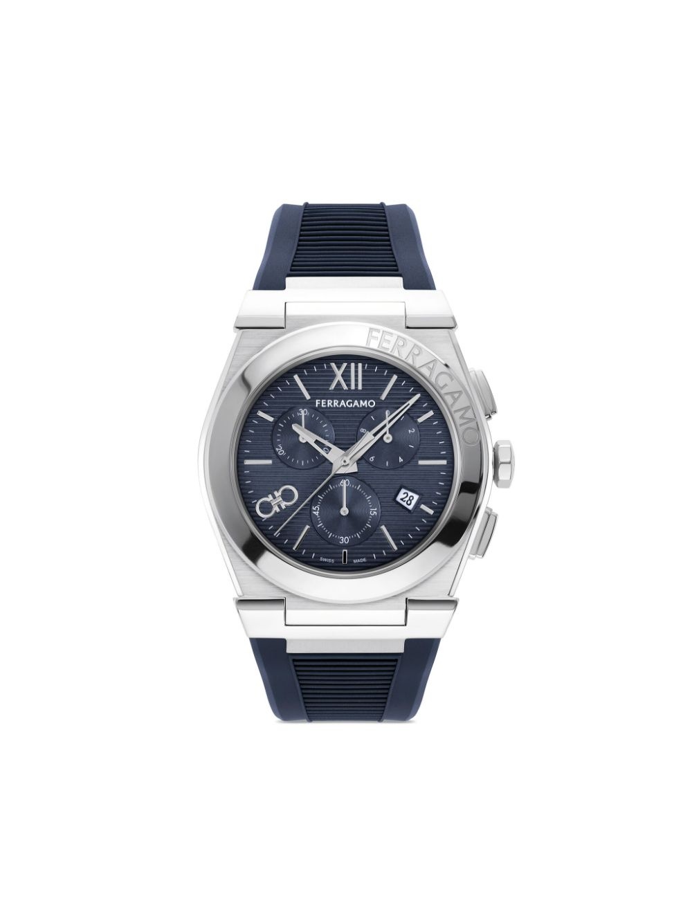 Vega Chronograph 42mm Highlights - 42mm - Stainless steel - Navy blue index dial - Round face - Three chronograph sub-dials - Logo-engraved bezel - Two chronograph pushers - Navy blue rubber strap - Deployant-clasp fastening - Date indication Imported Composition Sapphire Crystal 100%, stainless steel 100%, Recycled Polyurethane 100% SIZE & FIT Measurement DIAMETER 1.65 in(4.2 cm)