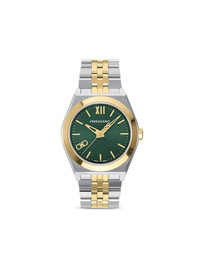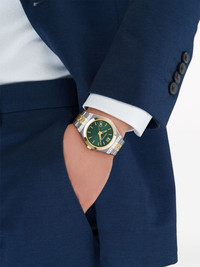 Vega New 40mm Highlights - 40mm - Stainless steel - Automatic movement - Green - Index dial - Roman numeral dial - Sword hands - Round face - Yellow-gold plated stainless steel bezel - Logo-embossed crown - Stainless steel link bracelet - Folding clasp Imported Composition Sapphire Crystal 100%, stainless steel 100%, Yellow Gold Plated Stainless Steel 100% SIZE & FIT Measurement DIAMETER 1.57 in(4 cm)