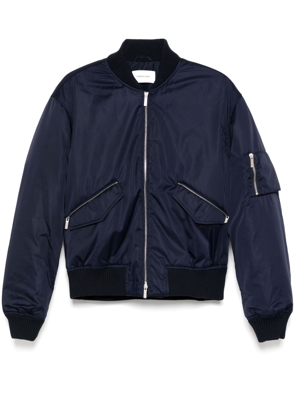 zip-up bomber jacket Highlights - Navy blue - Front two-way zip fastening - Two front button-fastening pockets - Baseball collar - Ribbed cuffs and hem Made in Italy Composition Polyester 100% Outer: Polyamide 100% SIZE & FIT Model measurements Height 6 ft 2 in(1.88 m) Bust/Chest 34.25 in(87 cm) Hips 34.64 in(88 cm) Waist 26.77 in(68 cm) FittingInformation Designed to be unstructured, offering a loose fit throughout The ribbed hem offers a close, comfortable fit Made from a padded non-stretch fabric, giving it no natural elasticity