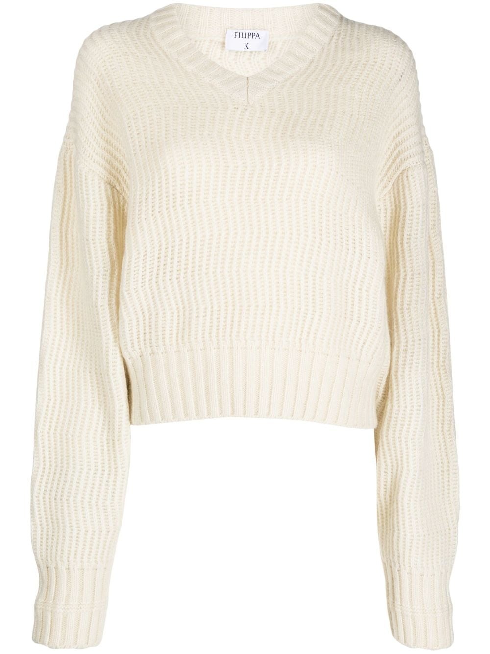 drop-shoulder chunky-knit jumper Highlights - Cream white - Chunky knit - Drop shoulder - V-neck - Long sleeves - Ribbed cuffs and hem - Straight hem Imported Composition Recycled Polyamide 44%, Alpaca 34%, RWS Wool 22% Washing instructions Hand Wash