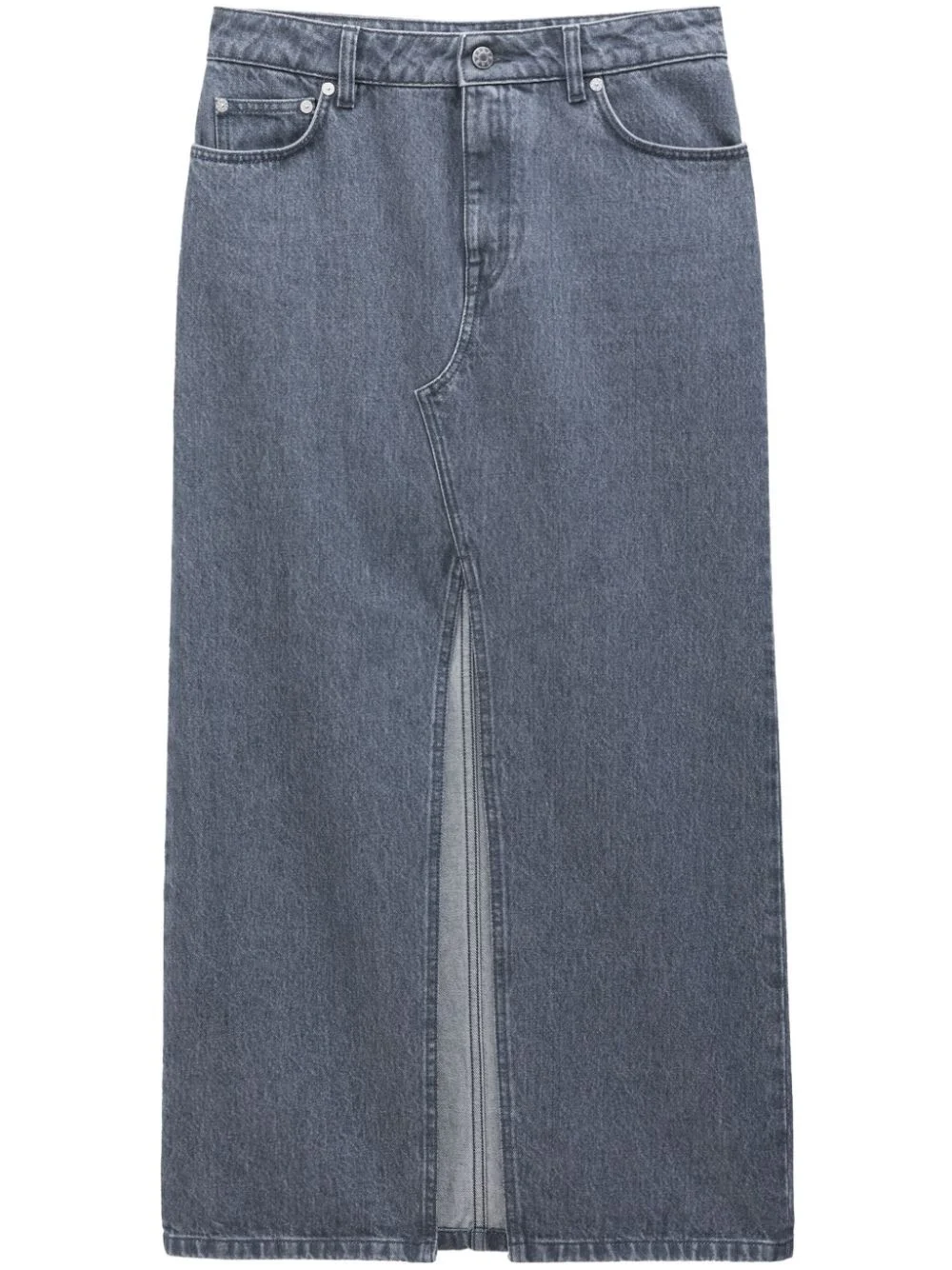 front-slit organic cotton maxi skirt Highlights - Grey - Organic cotton - Denim - Applique logo - Front slit - Belt loops - Front button fastening - Classic five pockets - Maxi - Straight hem Made in Italy Composition Organic Cotton 100% Washing instructions Machine Wash