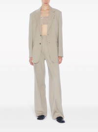 single-breasted melange blazer Filippa K's natural affinity for confident, easy dressing is masterfully captured in the clean lines of this single-breasted blazer. Riffing on a classic silhouette, it's defined by its single-breasted fastening. Highlights - Sage green - Melange effect - Notched lapels - Front button fastening - Shoulder pads - Long sleeves - Buttoned cuffs - Chest welt pocket - Two front flap pockets - American rear vent - Full lining - Internal logo patch - Internal slip pocket Imported Composition Lining: Polyester 54%, Viscose 46% Outer: Polyester 54%, Merino 44%, Elastane 2% Washing instructions Dry Clean Only