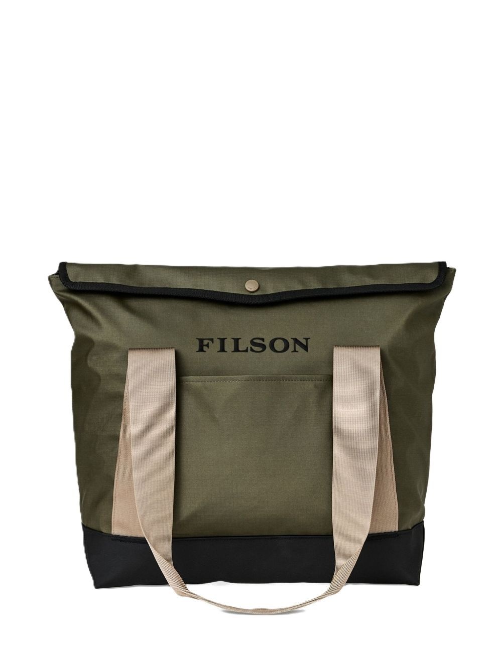 All-Weather double-handle tote bag Highlights - Olive green - Black base - Beige handles - Snap closure - Internal pocket - Logo lettering Imported Composition Outer: Recycled Polyester 100% SIZE & FIT Measurement DEPTH 8 in(20.3 cm) HEIGHT 15 in(38.1 cm) WIDTH 14.5 in(36.8 cm)
