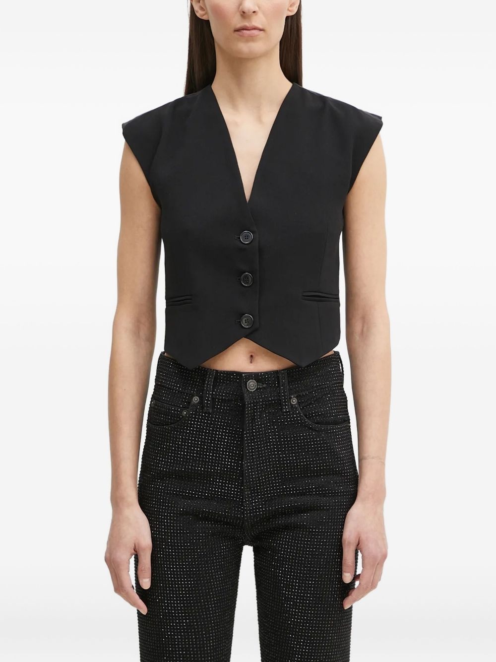 button-fastening sleeveless top Highlights - Black - V-neck - Sleeveless design - Cropped length - Button fastening - Back buckle Made in United Kingdom Composition Polyester 100% Washing instructions Read Manufacturer Guidelines