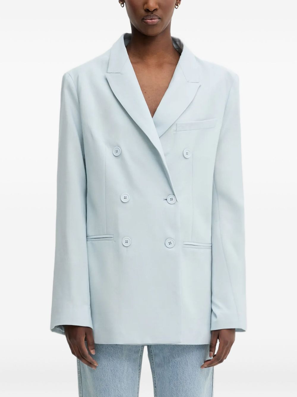 double-breasted embroidered blazer Highlights - Light blue - Double-breasted fastening - Peak lapels - Embroidered detail - Long sleeves Imported Composition Virgin Wool 100% Washing instructions Read Manufacturer Guidelines