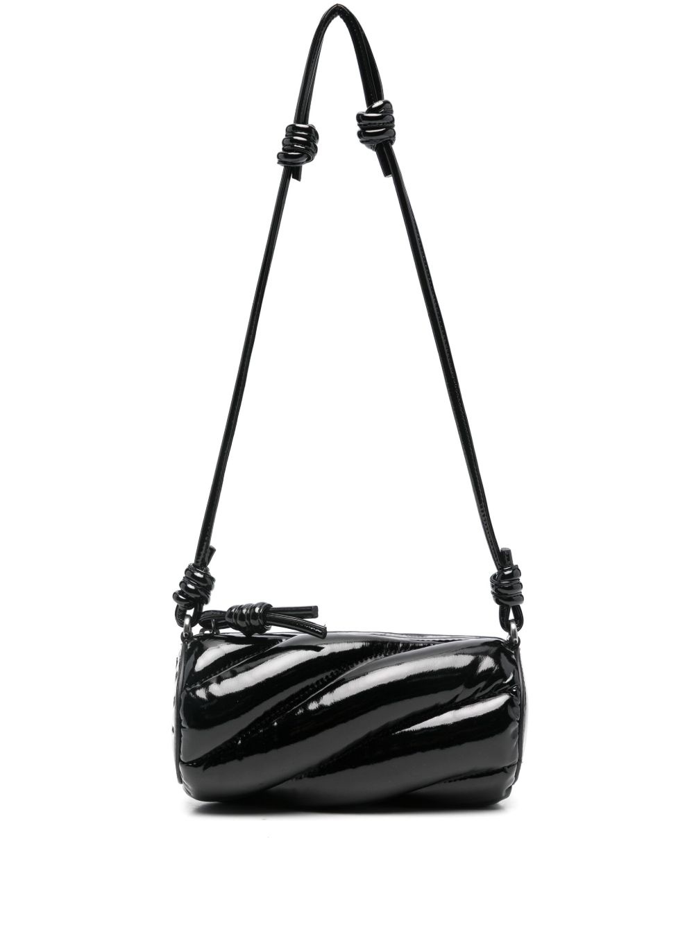 micro Mella shoulder bag Highlights - Black - Artificial leather - High-shine finish - Padded design - Horizontal stripe pattern - Twisted design - Cylinder body - Top zip fastening - Adjustable shoulder strap - Embroidered logo to the side - Main compartment - Debossed internal logo - Internal card slot - Full lining Made in Italy Composition Outer: Artificial Leather 100% SIZE & FIT Measurement DEPTH 2.75 in(7 cm) HEIGHT 3.93 in(10 cm) STRAP 33.46 in(85 cm) WIDTH 7.87 in(20 cm)