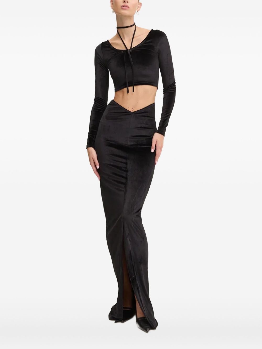 tie-neck velvet top Highlights - Black - Velvet texture - Tie neck - Long sleeves - Square neck Made in Italy Composition Polyester 93%, Elastane 7% Washing instructions Hand Wash