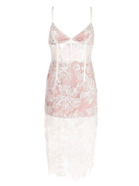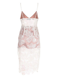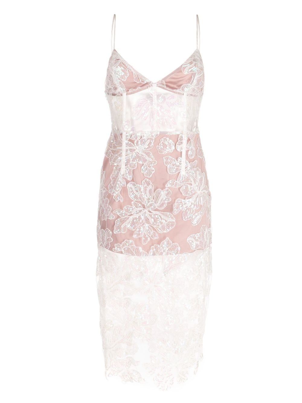 floral-embroidered sequinned midi dress Highlights - Ivory white/peach pink - Stretch-silk - Silk lining - Layered effect - Floral embroidery - V-neck - Two adjustable shoulder straps - Lettuce hem - Mid-length Imported Composition Body: Silk 92%, Elastane 8% Lining: Silk 100% Outer: Nylon 100%