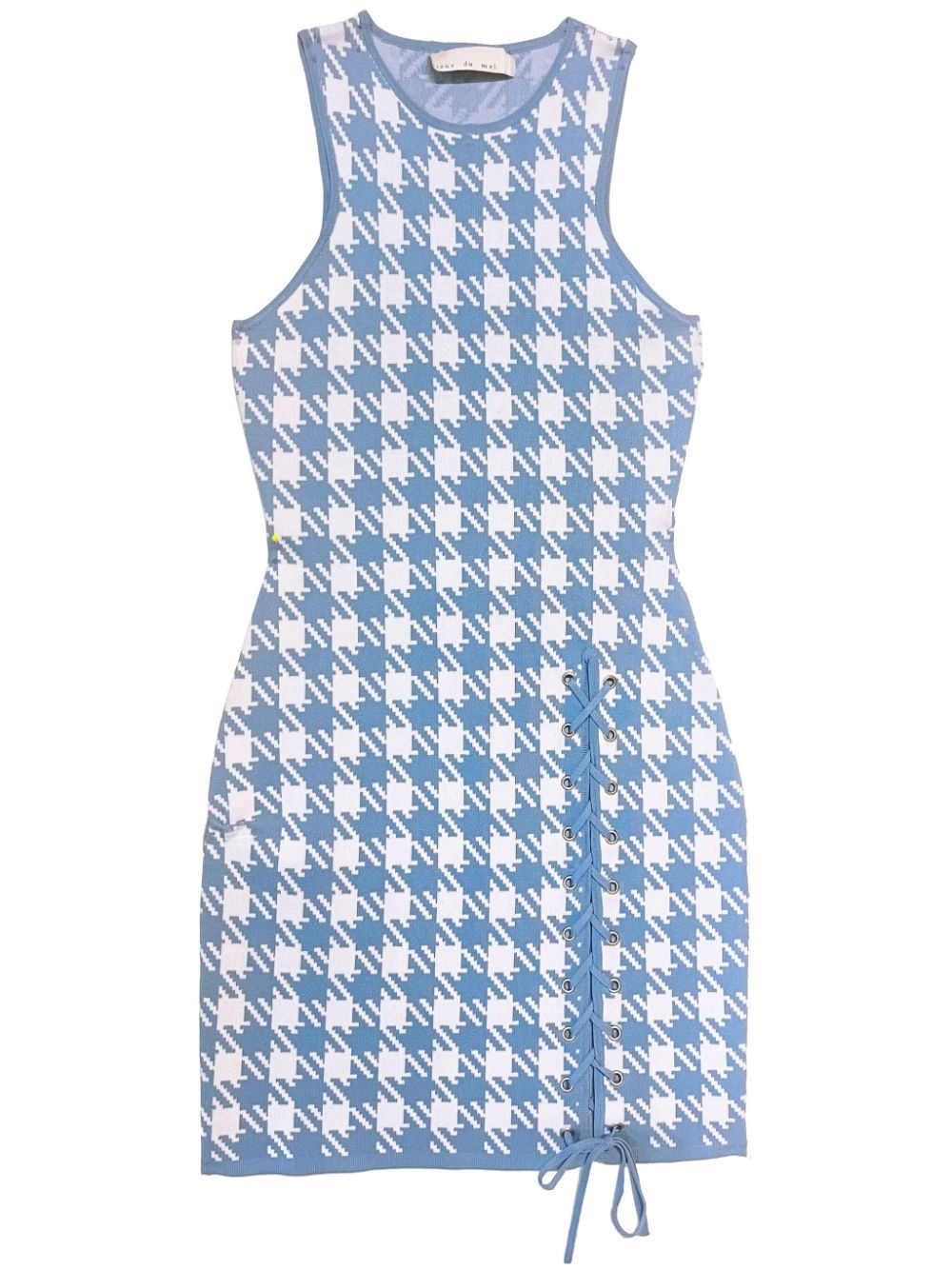 houndstooth-intarsia knitted mini dress Highlights - Light blue/white - Stretch-design - Houndstooth pattern - Lace-up detailing - Round neck - Sleeveless - Straight hem Imported Composition Viscose 71%, Nylon 29% SIZE & FIT Measurement HIPS 32 in(81.3 cm) LENGTH 32.51 in(82.6 cm) WAIST 24.01 in(61 cm) BUST 30 in(76.2 cm) Washing instructions Dry Clean Only