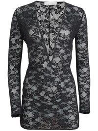 Le Stretch lace plunge mini dress Highlights - Black - Recycled nylon blend - Stretch-design - Floral-lace detailing - Plunging v-neck - Long sleeves - Straight hem Imported Composition Outer: Nylon 37%, Elastane 34%, Recycled Nylon 29% Silk 95%, Elastane 5% SIZE & FIT Measurement LENGTH 33.07 in(84 cm) WAIST 22.83 in(58 cm) BUST 26.77 in(68 cm) Shoulder Width 11.81 in(30 cm)