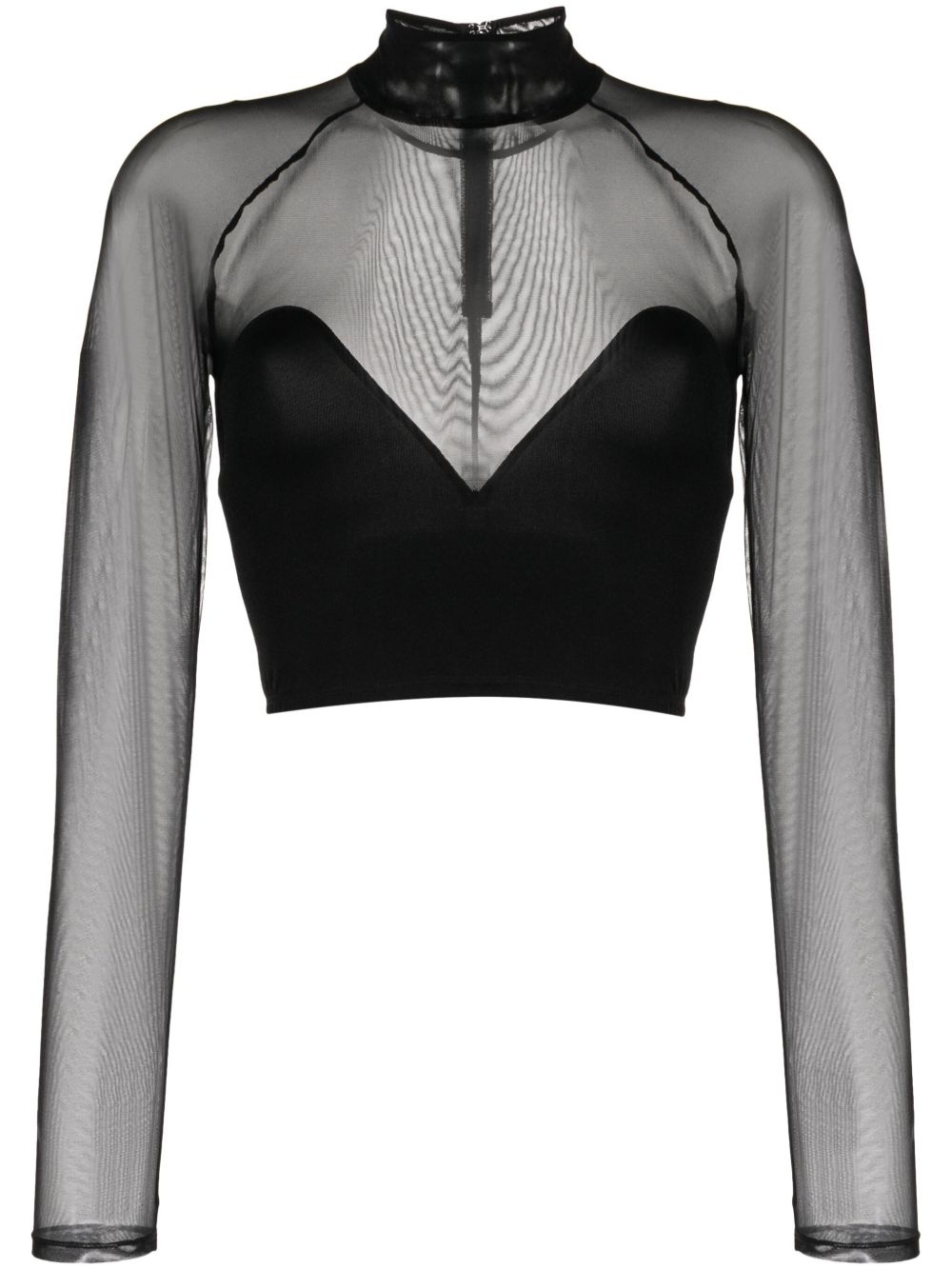 mesh mock-neck crop top Highlights - Black - Stretch-design - Mesh panelling - Mock neck - Long sleeves - Straight hem - Cropped Imported Composition Body: Nylon 95%, Spandex/Elastane 5% SIZE & FIT Model measurements Height 5 ft 9 in(1.75 m) Bust/Chest 30.31 in(77 cm) Hips 35.03 in(89 cm) Waist 23.22 in(59 cm) FittingInformation Designed for a close fit throughout Cropped in length Made from a lightweight stretch fabric, this piece offers elasticity and flexibility when worn This piece fits close in all sizes – take your usual size Washing instructions Hand Wash