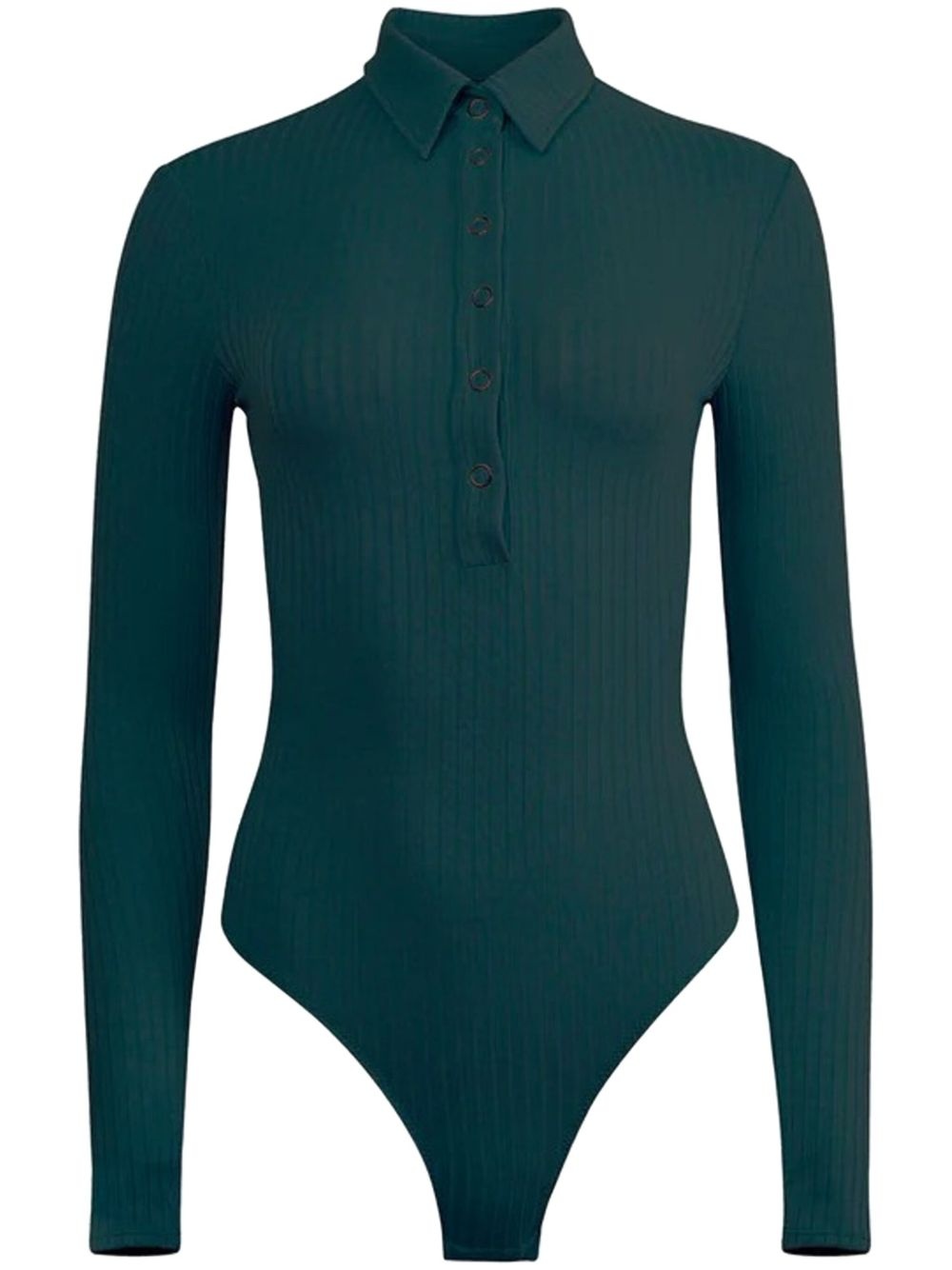 ribbed-knit bodysuit Highlights - Dark green - Press-stud fastening - Classic collar - Long sleeves - Just a reminder that this piece must be tried on over your own garments. Imported Composition Polyester 80%, Rayon 16%, Spandex/Elastane 4%