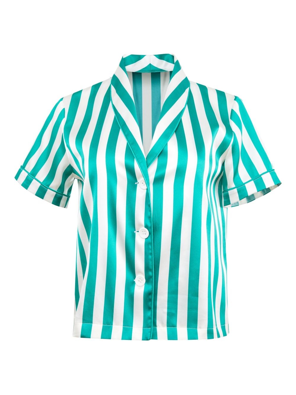 Riviera shirt Highlights - Jade green - Front button fastening - Vertical stripe pattern - Shawl lapels - Short sleeves Imported Composition Polyester 100%, Silk 92%, Elastane 8% Washing instructions Hand Wash