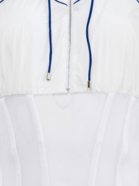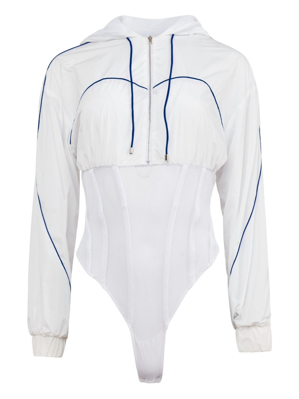 Trackstar bodysuit Highlights - White - Short front zip fastening - Drawstring hood - Long sleeves - Just a reminder that this piece must be tried on over your own garments. Imported Composition Lining: Polyester 100% Outer: Nylon 75%, Recycled Polyester 25% Washing instructions Hand Wash