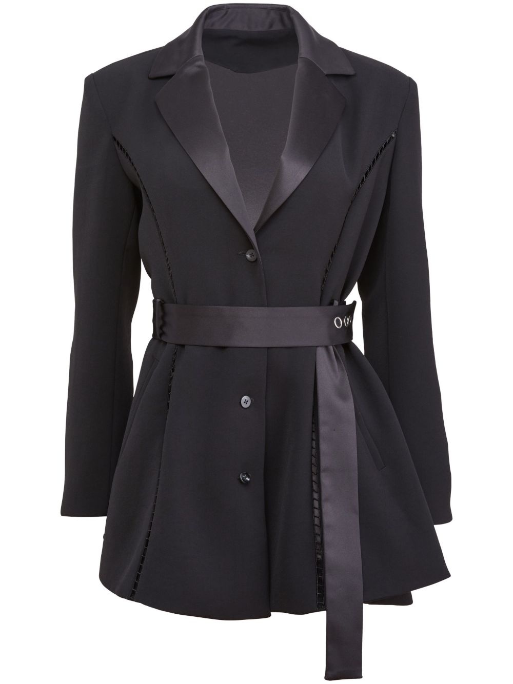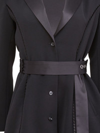 tuxedo mini dress Highlights - Black - Silk - Front button fastening - Notched lapels - Detachable and adjustable waist belt - Belt loops - Two side welt pockets - Long sleeves - Full lining - Straight hem - Thigh-length Imported Composition Lining: Polyester 100% Outer: Silk 100%, Recycled Polyester 100%