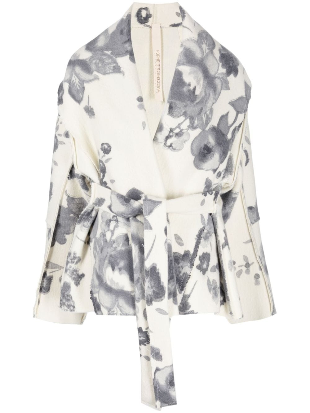 floral-print belted short coat Highlights - Grey/white - Wool-cotton blend - Cotton lining - All-over floral print - Shawl lapels - Belted waist - Long sleeves - Straight hem Made in Italy Composition Outer: Wool 79%, Polyamide 20%, Cotton 1% Lining: Cotton 100% SIZE & FIT Model measurements Height 5 ft 10 in(1.77 m) Bust/Chest 31.49 in(80 cm) Hips 35.43 in(90 cm) Waist 25.19 in(64 cm) FittingInformation Designed for a boxy fit, intended for a loose fit throughout The tie fastening gives an adaptable and personalised fit Made from a heavyweight non-stretch fabric This piece fits true to size – take your usual size Washing instructions Dry Clean Only