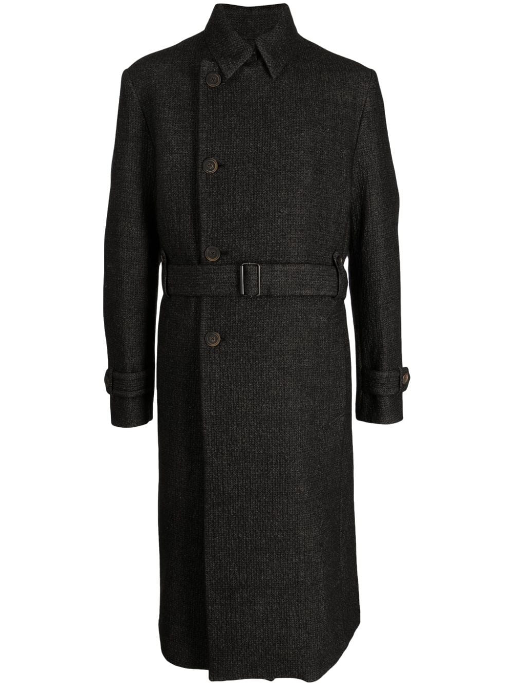 off-centre button-up coat Highlights - Medium grey - Wool blend - Cotton - Classic collar - Off-centre front button fastening - Detachable and adjustable waist belt - Long sleeves - Two side slit pockets - Mid-length Made In Italy Composition Outer: Wool 66%, Linen/Flax 18%, Polyamide 16% Trims: Cotton 100% Lining: Acetate 50%, Viscose 50% Washing instructions Dry Clean Only
