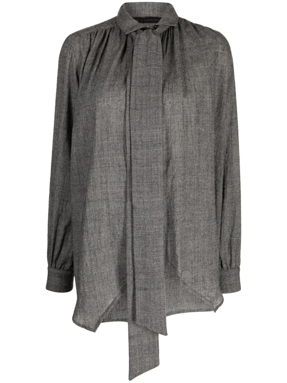 plaid pussy-bow blouse Highlights - Heather grey - Virgin wool - Plaid check pattern - Pleat detailing - Pussy-bow collar - Spread collar - Long sleeves - Buttoned cuffs - Asymmetric hem Made in Italy Composition Body: Virgin Wool 100% Washing instructions Dry Clean Only