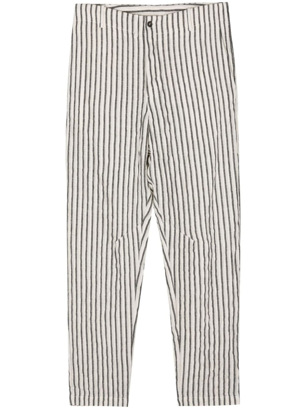 striped linen-blend tapered trousers Highlights - White/grey - Linen-cotton blend - Vertical stripe pattern - Belt loops - Concealed fly and button fastening - Tapered leg - Two side slit pockets - Rear patch pocket - Straight hem Made in Italy Composition Outer: Linen/Flax 67%, Cotton 31%, Silk 2% Lining: Cotton 100%
